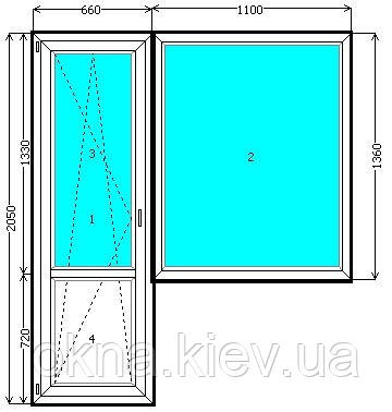 Показати оптові ціниБалконний блок із німецького профілю КВЕ: розмір — балконні двері поворотно-відкидні (2050*660) внизу сендвіч-панель, вікно глухе (1100*1360)